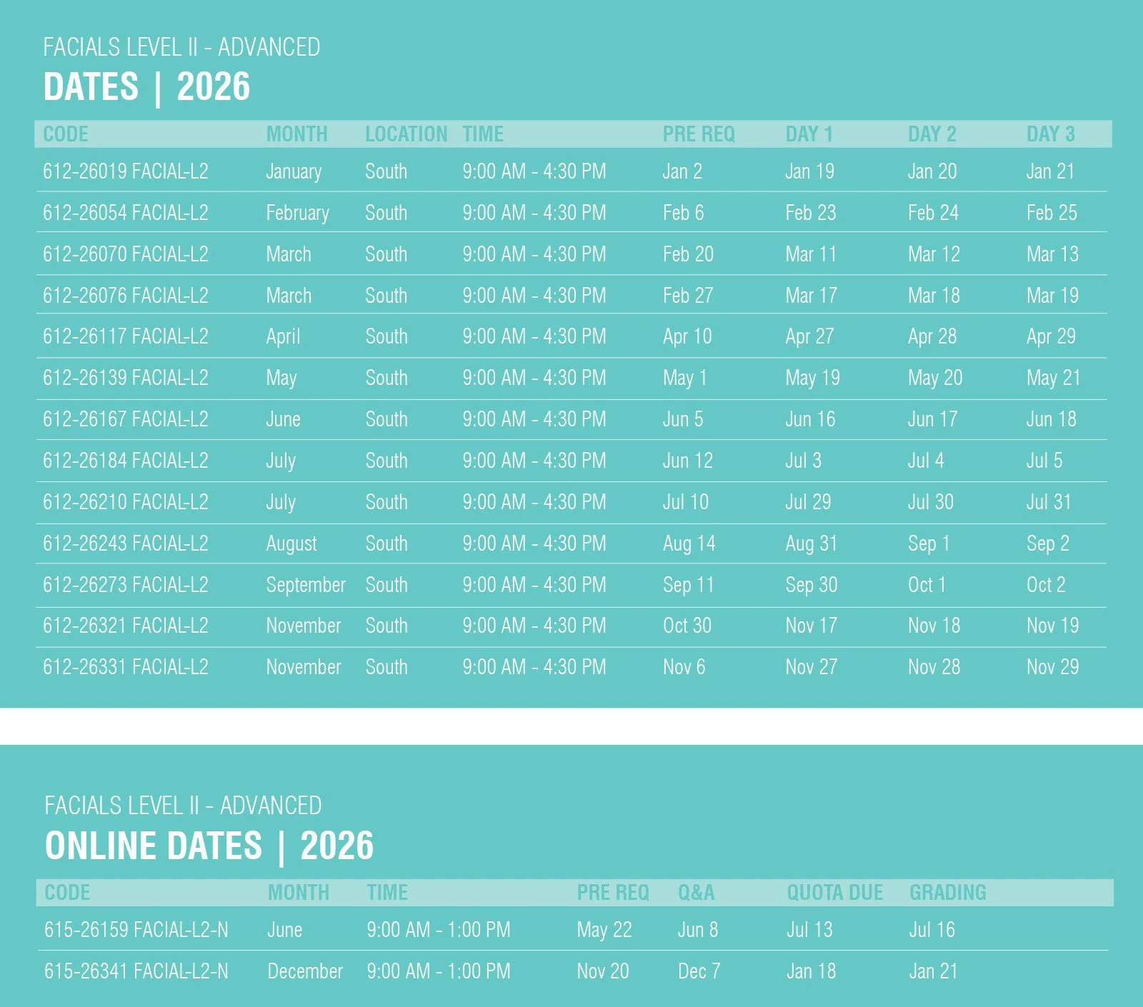 Your scheduled exam date indicates the deadline for class so you will be required to submit your 6 quotas forms to your Google Drive and when your theory exam becomes available on Moodle, you are welcome to take the exam. A full video of your facial service is required for the final practical exam so please ensure you have a model arranged and have a phone, laptop or computer webcam to film the entire service; more detailed instructions will be provided upon enrollment. Students must have a gmail account to access the online platform.