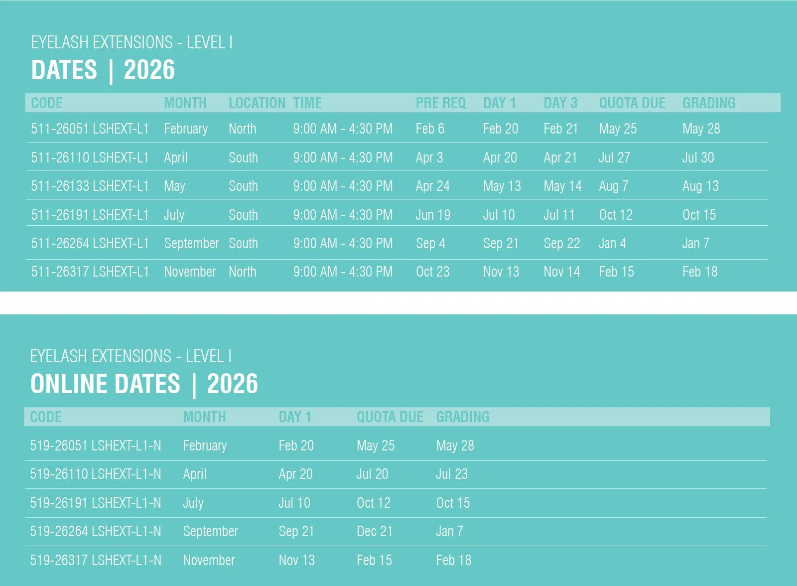 Students must complete 7 eyelash extension quotas outside of class and submit before & after pictures of their quotas within 12 weeks to earn certification.