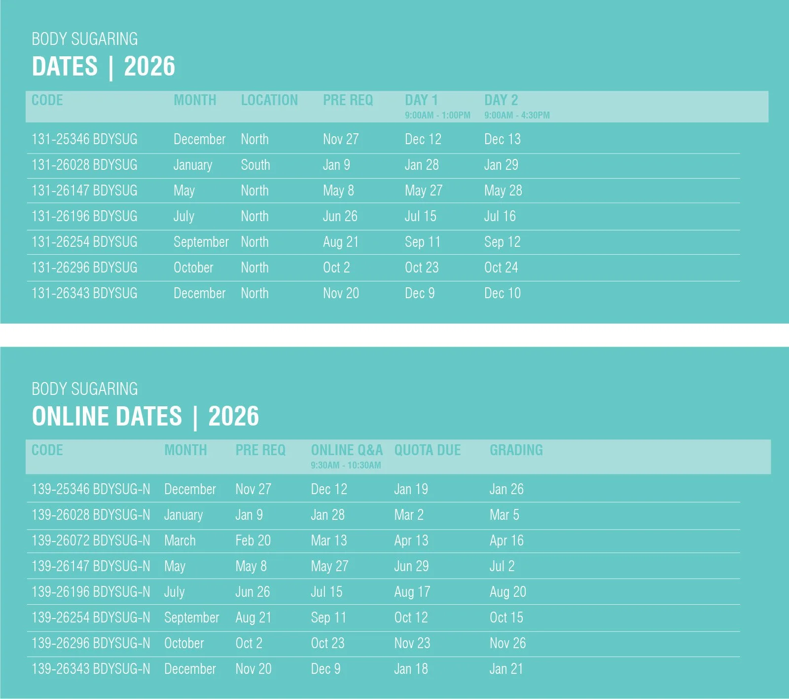We will require students to submit before/during & after photos of 4 Body Sugaring quotas/practicum (2 large and 2 small areas) to showcase learned skills. This will be reviewed in your Q & A session with the instructor.